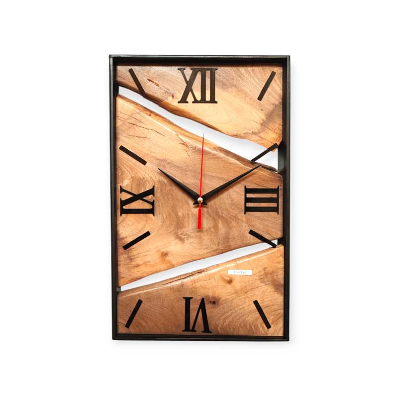 • ساعت دیواری مستطیلی از چوب گردو طبیعی با فریم مشکی مات، موتور آرامگرد بی‌صدا و یکسال ضمانت.